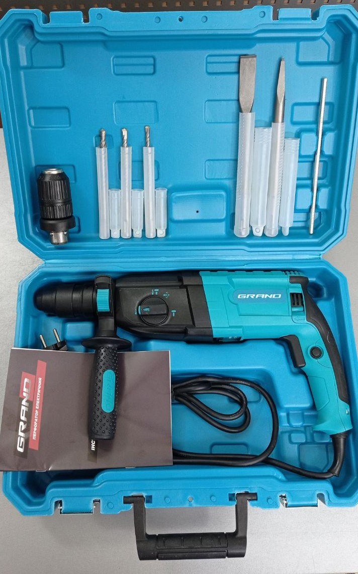 Комплектація | Швидкозатискний патрон (DFR), Бури, Зубіло, Піка, Додаткова рукоятка, Обмежувач глибини, Інструкція з експлуатації, Гарантійний талон |